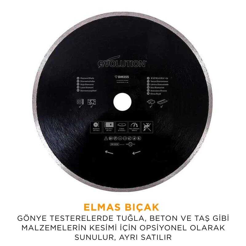 ● The Evolution 255mm Diamond blade can also be fitted for cutting ceramic tiles and ornamental stone, (sold separately).