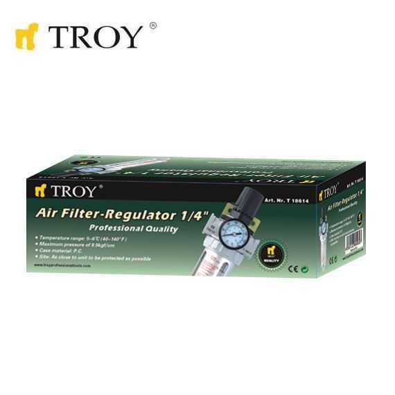 ● Combined filter and regulator ● Controls the flow of fluids and gases within a conduit or medium ● Reduces the pressure in high pressure fluid supply lines to allowable or safe limits ● Eliminates the moisture in the air supplied from air supply tanks ● Operating pressure: 10-120 psi ● T 18614 Air inlet/outlet: 1/4"(N)PT Weight (Kg):0.8